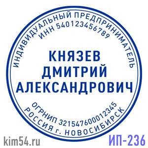 Заказать печать предпринимателя, печать ИП-236. Срочное изготовление печати предпринимателя - 15 минут. Стандартный срок изготовления печати ИП от 2-х до 4-х часов. Печать индивидуального предпринимателя изготавливается диаметром 38 мм. В печати ИП обя...