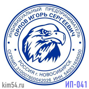 Заказать печать с орлом, печать ИП-041. Срочное изготовление печати - 15 минут. Обычный срок изготовления - 2 часа. Диаметр печати - 38 мм. В печати ИП обязательно указывается ФИО предпринимателя. ИНН, ОГРНИП указывается по желанию. На основе шаблона п...