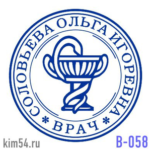 Заказать печать врача В-58. В печати врача можно указать специализацию, а также ученую степень врача. На печати врача можно разместить любое изображение, например, картинку чаши с змеей, логотип больницы в которой работает врач или другое изображение, ...