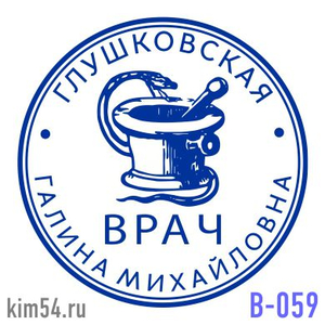 Заказать печать врача В-59. Срочное изготовление печати врача 15 минут. Стандартный срок изготовления печати врача - 2 часа. Печать врача изготавливается диаметром - 25-30 мм. Оптимальный размер врачебной печати составляет 29 мм. Возможно изготовление ...
