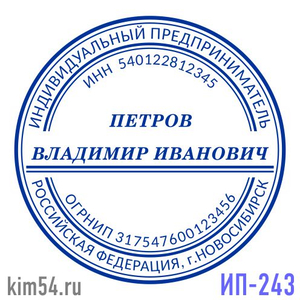 Печать предпринимателя, печать ИП-243. Срочное изготовление печати предпринимателя - 15 минут. Стандартный срок изготовления печати ИП от 2-х до 4-х часов. Печать индивидуального предпринимателя изготавливается диаметром 38 мм. В печати ИП обязательно ...