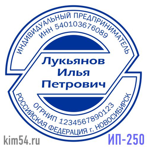 Печать предпринимателя, печать ИП-250. Срочное изготовление печати ИП - 15 минут. Стандартный срок изготовления печати предпринимателя от 2-х до 4-х часов. Печать индивидуального предпринимателя изготавливается диаметром 38 мм. В печати ИП указывается ...