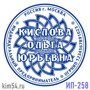 Заказать печать ИП-258 Срочное изготовление печати предпринимателя - 15 минут. Стандартный срок изготовления печати ИП от 2-х до 4-х часов. Печать индивидуального предпринимателя изготавливается диаметром 38 мм. В печати ИП обязательно указывается ФИО ...