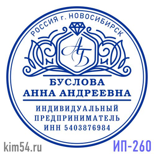 Заказать печать с монограммой ИП-260. Срочное изготовление печати предпринимателя - 15 минут. Стандартный срок изготовления печати ИП от 2-х до 4-х часов. Печать индивидуального предпринимателя изготавливается диаметром 38 мм. В печати ИП обязательно у...