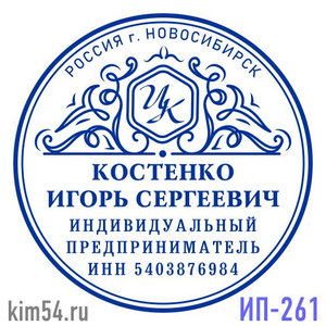 Заказать печать с монограммой и вензелями ИП-261. Срочное изготовление печати предпринимателя - 15 минут. Стандартный срок изготовления печати ИП от 2-х до 4-х часов. Печать индивидуального предпринимателя изготавливается диаметром 38 мм. В печати ИП о...
