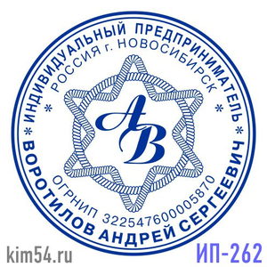 Печать с монограммой. Печать предпринимателя П-262. Срочное изготовление печати предпринимателя - 15 минут. Стандартный срок изготовления печати ИП от 2-х до 4-х часов. Печать индивидуального предпринимателя изготавливается диаметром 38 мм. В печати ИП...