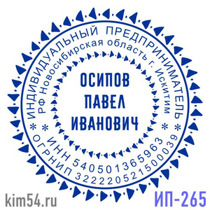 Заказать печать ИП-265. Срочное изготовление печати предпринимателя - 15 минут. Стандартный срок изготовления печати ИП от 2-х до 4-х часов. Печать индивидуального предпринимателя изготавливается диаметром 38 мм. В печати ИП обязательно указывается ФИО...