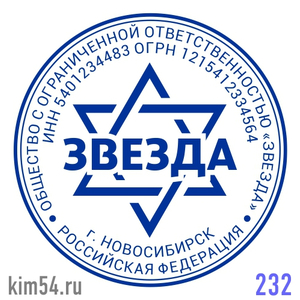 Заказать печать с звездой Давида № 232. Срочное изготовление печати ООО - 15 минут. Стандартный срок изготовления печати организации от 2-х до 4-х часов. Размер печати ООО - 38 мм. Если требуется согласование макета печати организации или срочное изгот...