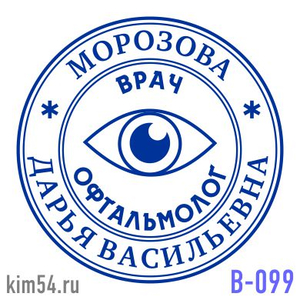 Заказать печать офтальмолога В-99. Срочное изготовление печати врача - 15 минут. Стандартный срок изготовления печати врача от 2-х до 4-х часов. Печать врача изготавливается диаметром - 25-30 мм. Оптимальный размер врачебной печати составляет 29 мм. Во...
