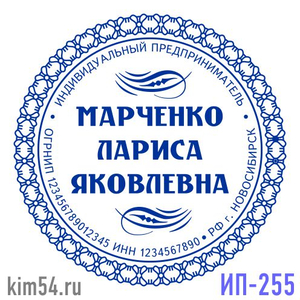 Заказать печать с красивой рамкой и узорами ИП-255 Печать предпринимателя, печать самозанятого. Срочное изготовление печати предпринимателя - 15 минут. Стандартный срок изготовления печати ИП от 2-х до 4-х часов. Печать индивидуального предпринимателя ...