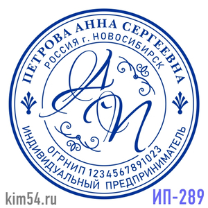 Заказать печать c монограммой ИП-289. Срочное изготовление печати предпринимателя - 15 минут. Обычный срок изготовления печати ИП от 2-х до 4-х часов. В печати ИП обязательно указывается ФИО предпринимателя, ИНН, ОГРНИП указывается по желанию. Печать и...