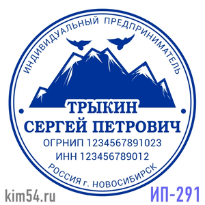 Печать с горами ИП-291. Срочное изготовление печати предпринимателя - 15 минут. Стандартный срок изготовления печати ИП от 2-х до 4-х часов. В печати ИП обязательно указывается ФИО предпринимателя, ИНН, ОГРНИП указывается по желанию. Печать индивидуаль...