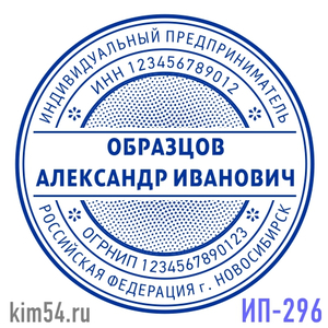 Заказать печать ИП-296. Срочное изготовление печати предпринимателя - 15 минут. Стандартный срок изготовления печати ИП от 2-х до 4-х часов. В печати ИП обязательно указывается ФИО предпринимателя, ИНН, ОГРНИП указывается по желанию. Печать индивидуаль...