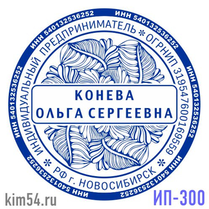 Печать предпринимателя с растительным орнаментом ИП-300. Срочное изготовление печати предпринимателя - 15 минут. Стандартный срок изготовления печати ИП от 2-х до 4-х часов. В печати ИП обязательно указывается ФИО предпринимателя, ИНН, ОГРНИП указывает...