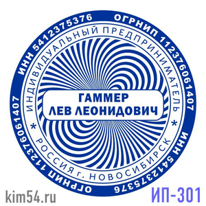 Печать предпринимателя ИП-301. Срочное изготовление печати предпринимателя - 15 минут. Стандартный срок изготовления печати ИП от 2-х до 4-х часов. В печати ИП обязательно указывается ФИО предпринимателя, ИНН, ОГРНИП указывается по желанию. Печать инди...
