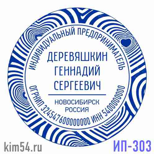 Печать предпринимателя ИП-303. Срочное изготовление печати предпринимателя - 15 минут. Стандартный срок изготовления печати ИП от 2-х до 4-х часов. В печати ИП обязательно указывается ФИО предпринимателя, ИНН, ОГРНИП указывается по желанию. Печать инди...