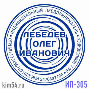 Печать предпринимателя ИП-305. Срочное изготовление печати предпринимателя - 15 минут. Стандартный срок изготовления печати ИП от 2-х до 4-х часов. В печати ИП обязательно указывается ФИО предпринимателя, ИНН, ОГРНИП указывается по желанию. Печать инди...