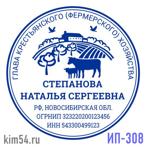Печать КФХ, печать крестьянского (фермерского) хозяйства ИП-308. Срочное изготовление печати предпринимателя - 15 минут. Стандартный срок изготовления печати ИП от 2-х до 4-х часов. В печати ИП обязательно указывается ФИО предпринимателя, ИНН, ОГРНИП у...