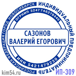 Печать предпринимателя, печать ИП-309. Срочное изготовление печати предпринимателя - 15 минут. Стандартный срок изготовления печати ИП от 2-х до 4-х часов. В печати ИП обязательно указывается ФИО предпринимателя, ИНН, ОГРНИП указывается по желанию. Печ...
