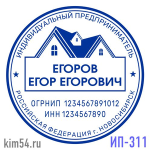 Печать с домом, печать ИП-311. Срочное изготовление печати предпринимателя - 15 минут. Стандартный срок изготовления печати ИП от 2-х до 4-х часов. В печати ИП обязательно указывается ФИО предпринимателя, ИНН, ОГРНИП указывается по желанию. Печать инди...