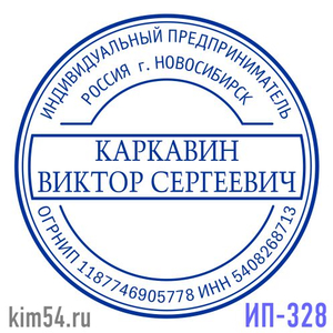 Заказать простую печать предпринимателя ИП-328. Срочное изготовление печати предпринимателя - 15 минут. Стандартный срок изготовления печати ИП от 2-х до 4-х часов. В печати ИП обязательно указывается ФИО предпринимателя, ИНН, ОГРНИП указывается по жел...