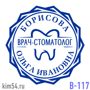 Печать врача-стоматолога В-117. Срочное изготовление печати врача 15 минут. Стандартный срок изготовления печати врача - 2 часа. При заказе печати можно указать специализацию врача (терапевт, хирург, дерматолог, стоматолог, офтальмолог и др.), а также ...