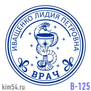 Печать врача с змеей и сосудом Гигиеи В-125. Срочное изготовление печати врача - 15 минут. Стандартный срок изготовления печати врача от 2-х до 4-х часов. Печать врача изготавливается диаметром - 25-30 мм. Оптимальный размер врачебной печати составляет...