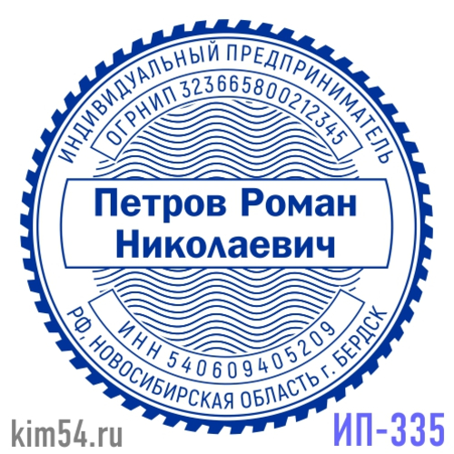 Печать с волнами и рамкой в виде шестерни ИП-335 Срочное изготовление печати предпринимателя - 15 минут. Стандартный срок изготовления печати ИП от 2-х до 4-х часов. В печати ИП обязательно указывается ФИО предпринимателя, ИНН, ОГРНИП указывается по же...
