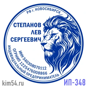 Лев на печати ИП-348. Срочное изготовление печати предпринимателя - 15 минут. Стандартный срок изготовления печати ИП от 2-х до 4-х часов. В печати ИП обязательно указывается ФИО предпринимателя, ИНН, ОГРНИП указывается по желанию. Печать индивидуально...