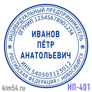 Простая печать ИП-401 Срочное изготовление печати предпринимателя - 15 минут. Стандартный срок изготовления печати ИП от 2-х до 4-х часов. В печати ИП обязательно указывается ФИО предпринимателя, ИНН, ОГРНИП указывается по желанию. Печать индивидуально...