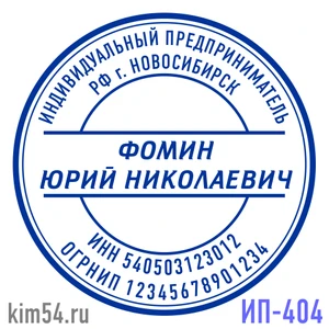 Простая печать ИП-404. Срочное изготовление печати предпринимателя - 15 минут. Стандартный срок изготовления печати ИП от 2-х до 4-х часов. В печати ИП обязательно указывается ФИО предпринимателя, ИНН, ОГРНИП указывается по желанию. Печать индивидуальн...