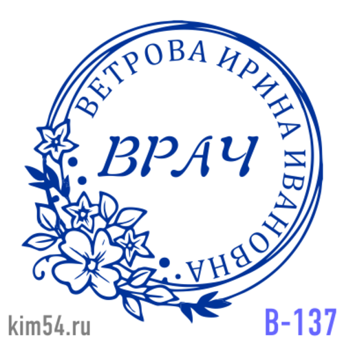 Печать врача с цветочным орнаментом В-137. Срочное изготовление печати врача 15 минут. Стандартный срок изготовления печати врача - 2 часа. При заказе печати можно указать специализацию врача (терапевт, хирург, дерматолог, стоматолог, офтальмолог и др....