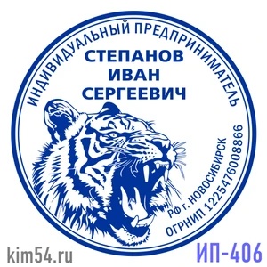 Заказать печать с тигром ИП-406. Срочное изготовление печати предпринимателя - 15 минут. Стандартный срок изготовления печати ИП - 2 часа. На основе печати предпринимателя можно изготовить печать самозанятого гражданина. В печати ИП обязательно указыва...