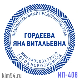 Печать ИП-408. Срочное изготовление печати предпринимателя - 15 минут. Стандартный срок изготовления печати ИП - 2 часа. На основе печати предпринимателя можно изготовить печать самозанятого гражданина. В печати ИП обязательно указывается ФИО предприни...
