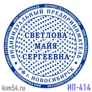 Печать с защитой в виде звезд ИП-414 Срочное изготовление печати предпринимателя - 15 минут. Стандартный срок изготовления печати ИП - 2 часа. На основе печати предпринимателя можно изготовить печать самозанятого гражданина. В печати ИП обязательно ука...