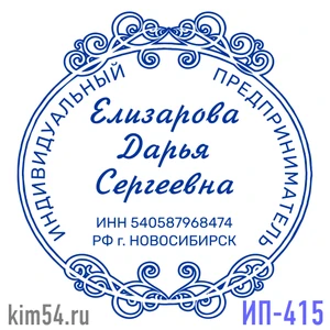 Печать с красивой рамкой ИП-415 Срочное изготовление печати предпринимателя - 15 минут. Стандартный срок изготовления печати ИП - 2 часа. На основе печати предпринимателя можно изготовить печать самозанятого гражданина. В печати ИП обязательно указывае...