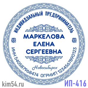 Печать с красивой рамкой и вензелем ИП-416 Срочное изготовление печати предпринимателя - 15 минут. Стандартный срок изготовления печати ИП - 2 часа. На основе печати предпринимателя можно изготовить печать самозанятого гражданина. В печати ИП обязатель...