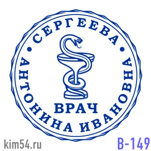 Печать врача со змеёй и сосудом Гигее В-149 Срочное изготовление печати врача 15 минут. Стандартный срок изготовления печати врача - 2 часа. Печать врача изготавливается диаметром - 25-30 мм. Оптимальный размер врачебной печати составляет 29 мм. Возможно