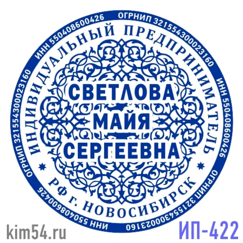Печать с орнаментом, печать ИП-422 Срочное изготовление печати предпринимателя - 15 минут. Стандартный срок изготовления печати ИП - 2 часа. На основе печати предпринимателя можно изготовить печать самозанятого гражданина. В печати ИП обязательно указывае